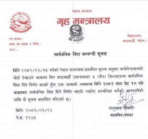 काठमाण्डौ । सरकारले आइतबार सार्वजयिनक बिदा दिने निर्णय गरेको छ । गृह मनत्रालयले एक सूचना जारी गर्दै जेठ १५ गते नेपाल राजपत्रमा प्रकाशित सूचना अनु्सार मत्सेयेन्द्रनाथको भोटो देखाउने जात्राको दिन काठमाण्डौ उपत्यकाका ३ वटा जिल्लामा सार्वजनिक बिदा दिने निर्णय भएको जनाएको छ ।